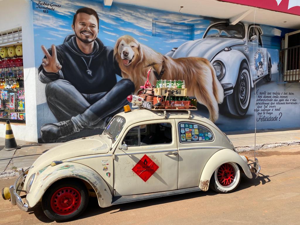O artista goiano Fábio Gomes, de 30 anos, fez uma obra na cidade de Trindade como forma de homenagem ao influenciador digital de Santa Catarina, Jesse Koz, que viajava pelo mundo com o cão Shurastey em um fusca. O catarinense e o animal morreram após acidente de trânsito nos EUA, no último dia 23 de maio.
