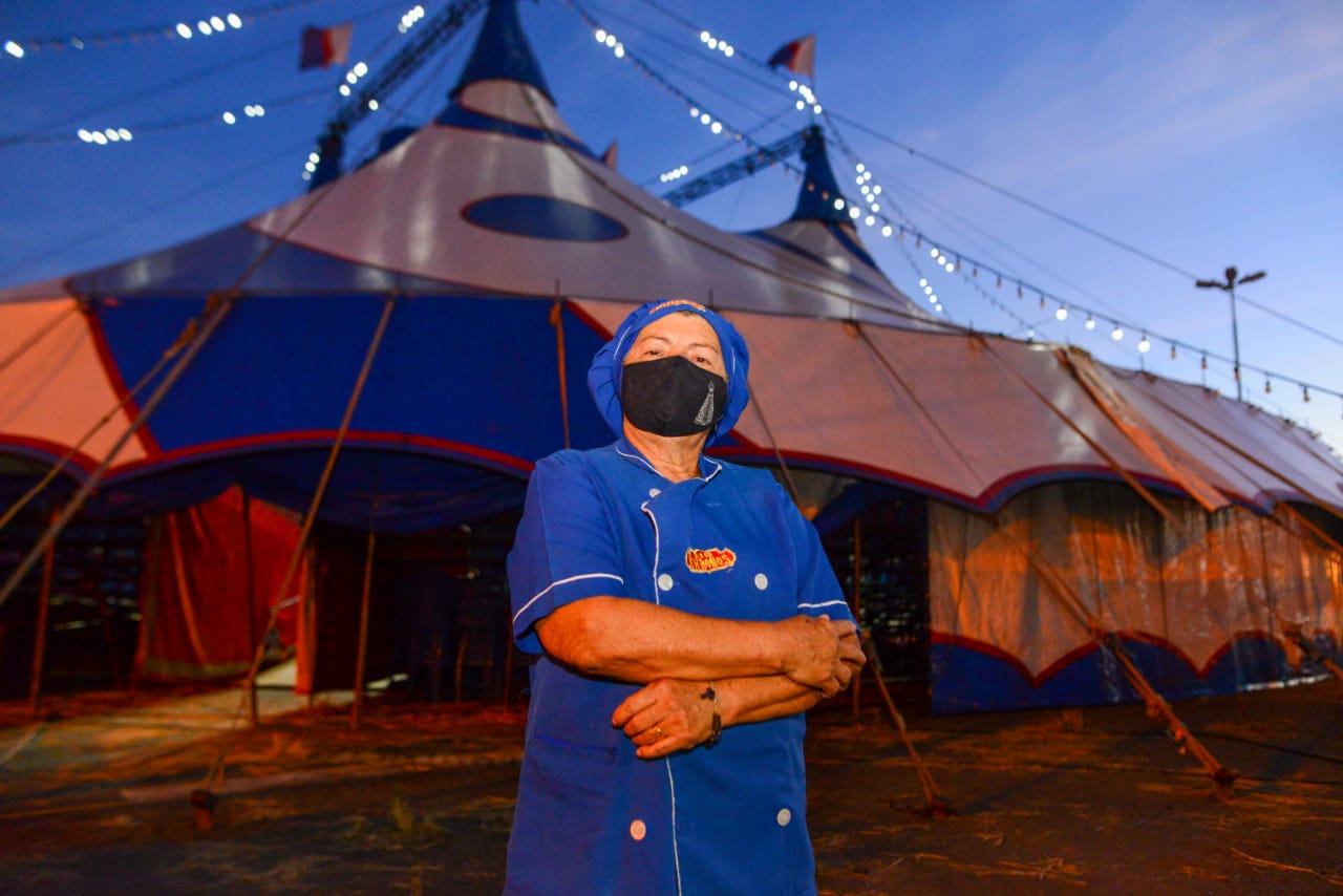 Rosa Maria da Costa, 68 anos, atualmente trabalha na lanchonete do Khronos. Há 54 anos vivendo “das alegrias do circo”, ela afirma que não se lembra de outro momento tão complicado para os artistas quanto nos meses que tiveram de fechar as portas em razão da Covid-19.
