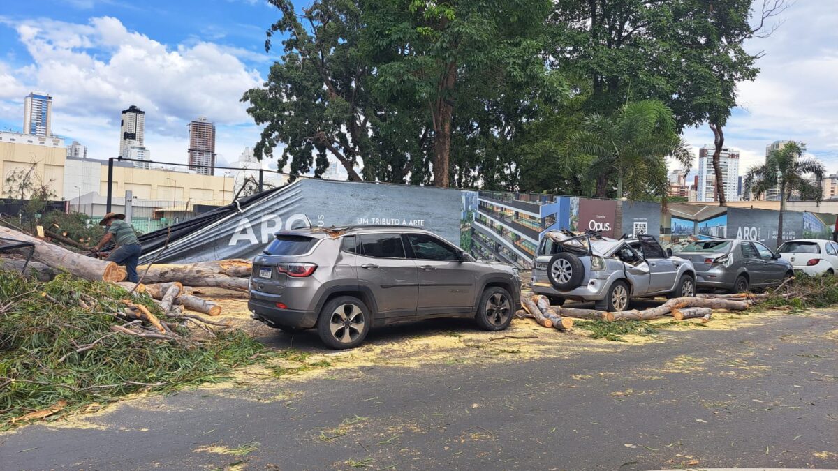 Árvore retirada de canteiro de obras cai sobre veículos no setor Bueno, em Goiânia