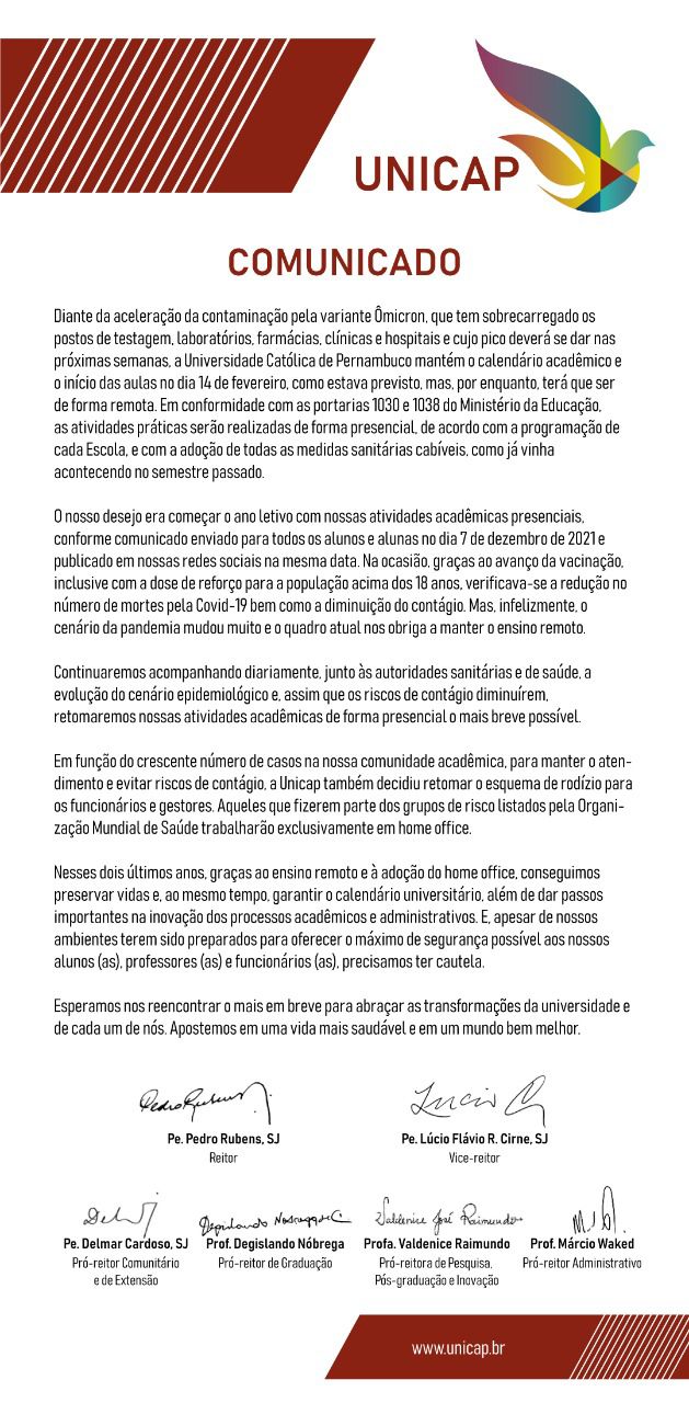 A Universidade Católica de Pernambuco (Unicap) emitiu nota pela manutenção do ensino remoto. “Diante da aceleração da contaminação pela variante Ômicron (…), a Universidade mantém o calendário acadêmico e iníico das aulas no dia 14 de fevereiro, como estava previsto, mas, por enquanto, terá que ser de forma remota.”