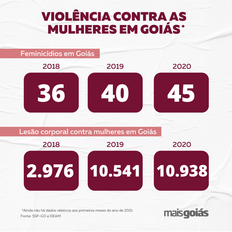 Também houve crescente com relação ao número de feminicídios em Goiás. De acordo com a pasta, 36 mulheres foram mortas baseadas na condição de gênero, em 2018, nas cidades goianas. Um ano depois, 40 mulheres tiveram a vidas ceifadas por companheiros ou ex-companheiros. Já em 2020, o número subiu para 45.