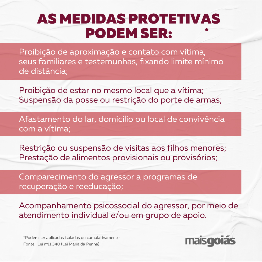 Além da ordem de afastamento do suposto agressor, as medidas protetivas podem determinar uma série de ações para garantir a integridade da vítima (vide infográfico abaixo). Entre elas, estão a proibição de estar no mesmo local que a vítima; restrição ou suspensão de visitas aos filhos menores; comparecimento do agressor a programas de recuperação e reeducação etc. Elas podem ser aplicadas juntas ou separadamente.