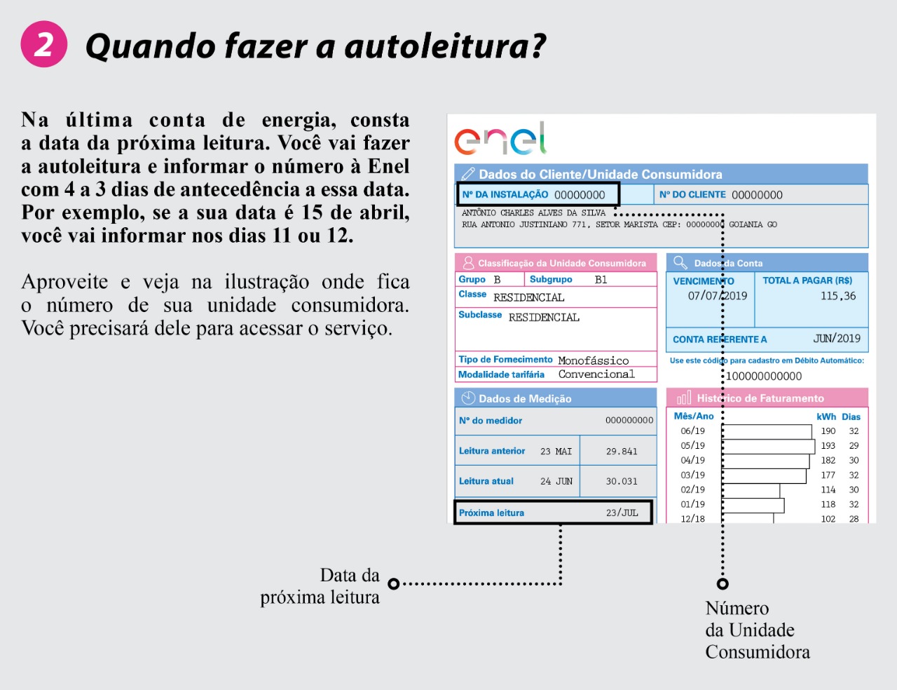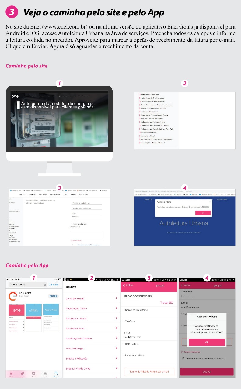 A autoleitura pode ser informada pelo site da Enel (www.enel.com.br) e já está disponível também no aplicativo Enel Goiás para Android e iOS. É preciso baixar a versão mais atual para contar com a funcionalidade.