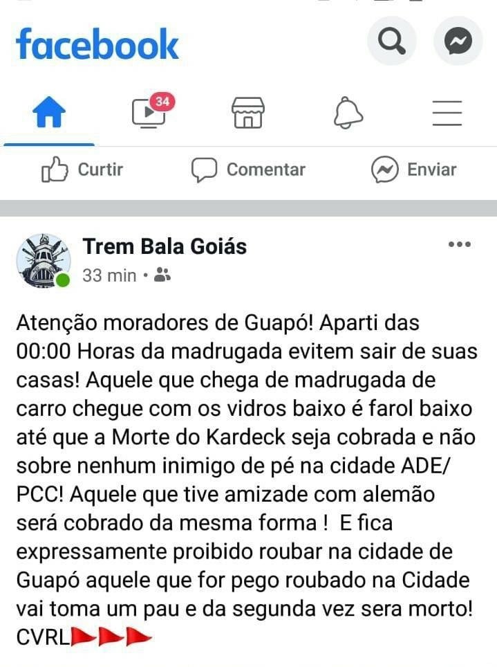 Uma postagem no Facebook e repassada através de grupos de WhatsApp tem espalhado pânico entre os moradores de Guapó. O município fica a 35,6 quilômetros da capital. A postagem, feita por um perfil chamado Trem Bala Goiás, diz que haverá retaliação pela morte de membro do Comando Vermelho (CV) na cidade. “Aparti (sic) das 00:00 Horas da madrugada evitem sair de suas casas”, diz a mensagem.