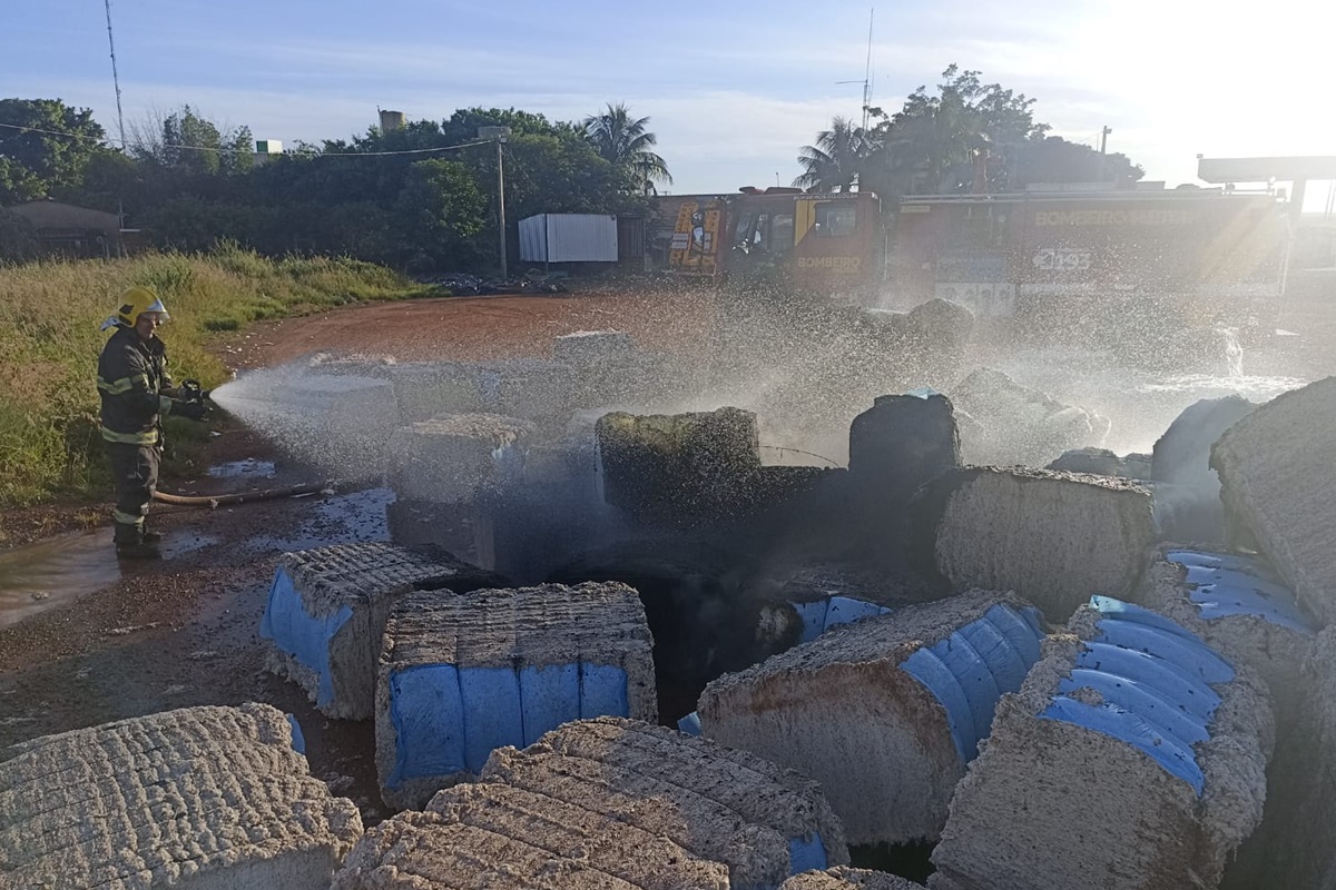 O Corpo de Bombeiros Militar de Goiás (CBMGO) combateu, na manhã deste domingo (12), um incêndio em carga de algodão. O caso aconteceu no Km 128 da BR-050, no pátio de um posto de combustível, em Cristalina.