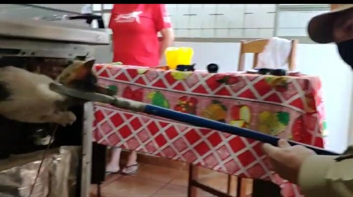 O felino ficou preso no compartimento interno do fogão. Entre o forno e o topo, onde fica o acionamento das chamas. Um vídeo mostra o momento em que os bombeiros desmontam o fogão e resgatam o animal.