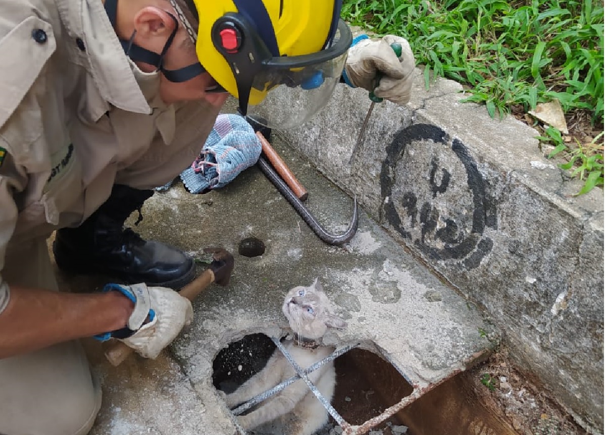 Bombeiros resgatam gato preso em tubulação no setor Cidade Jardim, em Goiânia