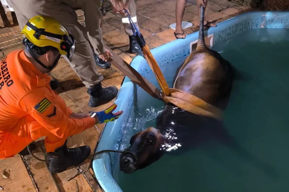 Uma equipe do Corpo de Bombeiros Militar do Estado de Goiás (CBMGO) realizou o resgate de uma vaca que caiu dentro de uma piscina na zona rural de Goianira. A ocorrência foi registrada na noite de sábado (7), por volta das 22h30, nas proximidades do Setor Triunfo 3.