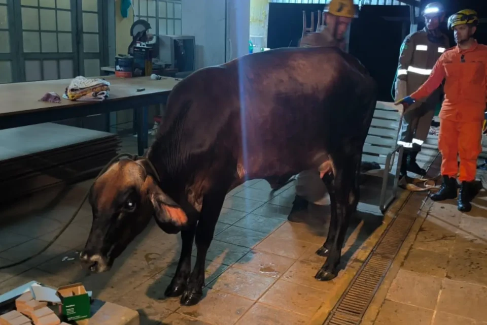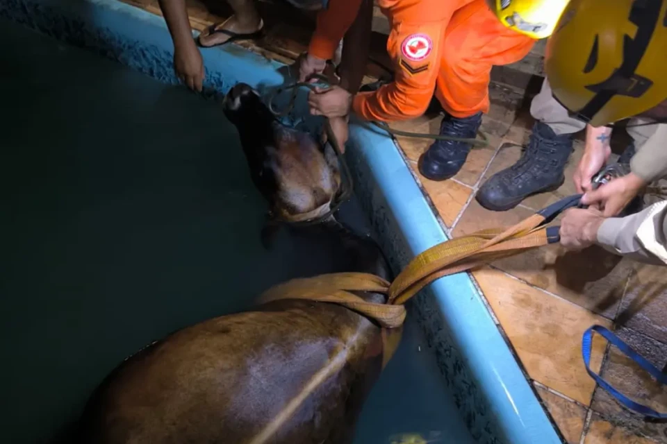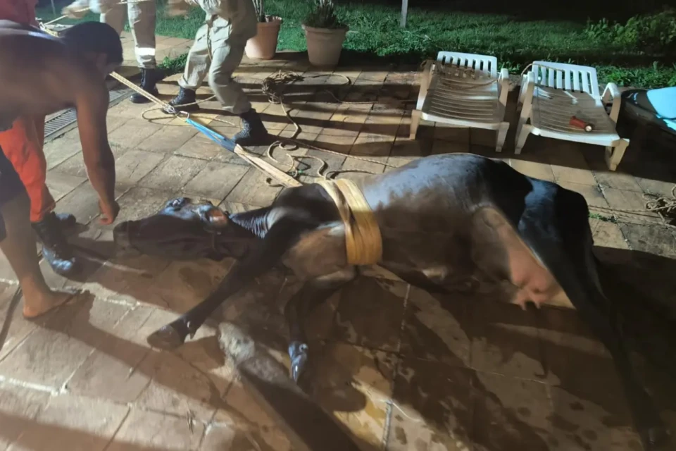 De acordo com os bombeiros, equipes da 20ª Companhia Independente Bombeiro Militar (20ª CIBM) foram acionadas para atender a situação envolvendo o animal de grande porte. Ao chegarem ao local, os militares constataram que a vaca havia caído dentro da piscina, o que exigiu uma atuação cuidadosa para evitar ferimentos e garantir a segurança durante o resgate.