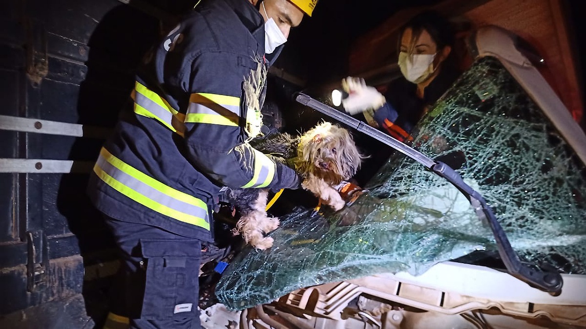 Bombeiros resgatem três pessoas e um cão de acidente entre dois caminhões