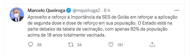 A declaração de Laval foi feita em entrevista à CBN nesta tarde (14), após Queiroga afirmar pelo Twitter que Goiás “está na parte debaixo da tabela de vacinação, com apenas 82% da população acima de 18 anos totalmente vacinada” contra o coronavírus. Porém, para a técnica do governo de Goiás, a realidade é outra e só poderá ser evidenciada após a atualização dos dados da imunização no estado.