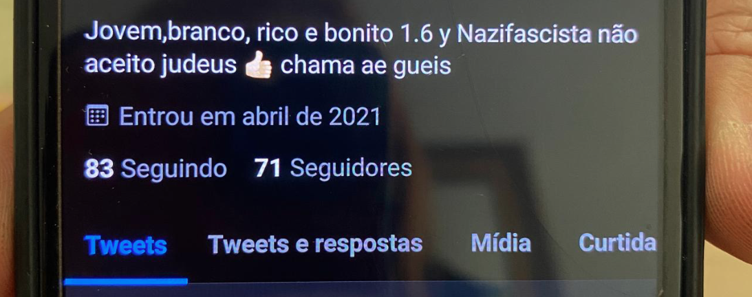Em uma conta no Twitter criada em abril de 2021, o rapaz se apresenta da seguinte forma: “jovem branco, rico e bonito, 1.6 y Nazifascista não aceito judeus chama ae gueis”.