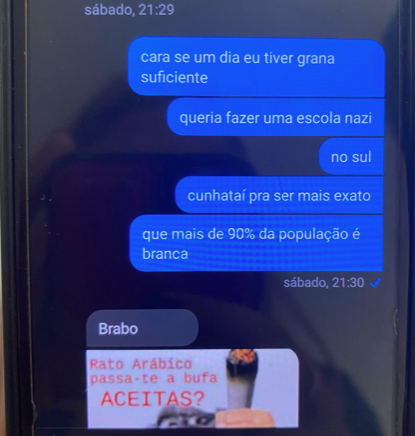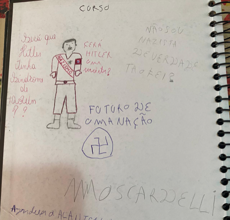 O caderno do adolescente tinha suásticas com o texto “futuro de uma nação” e um desenho de Hitler. No celular que encontrado pela polícia, o jovem diz a um amigo que sonhava abrir uma escola nazista no município de Cunhataí (Santa Catarina), “em que mais de 90% da população é branca”.