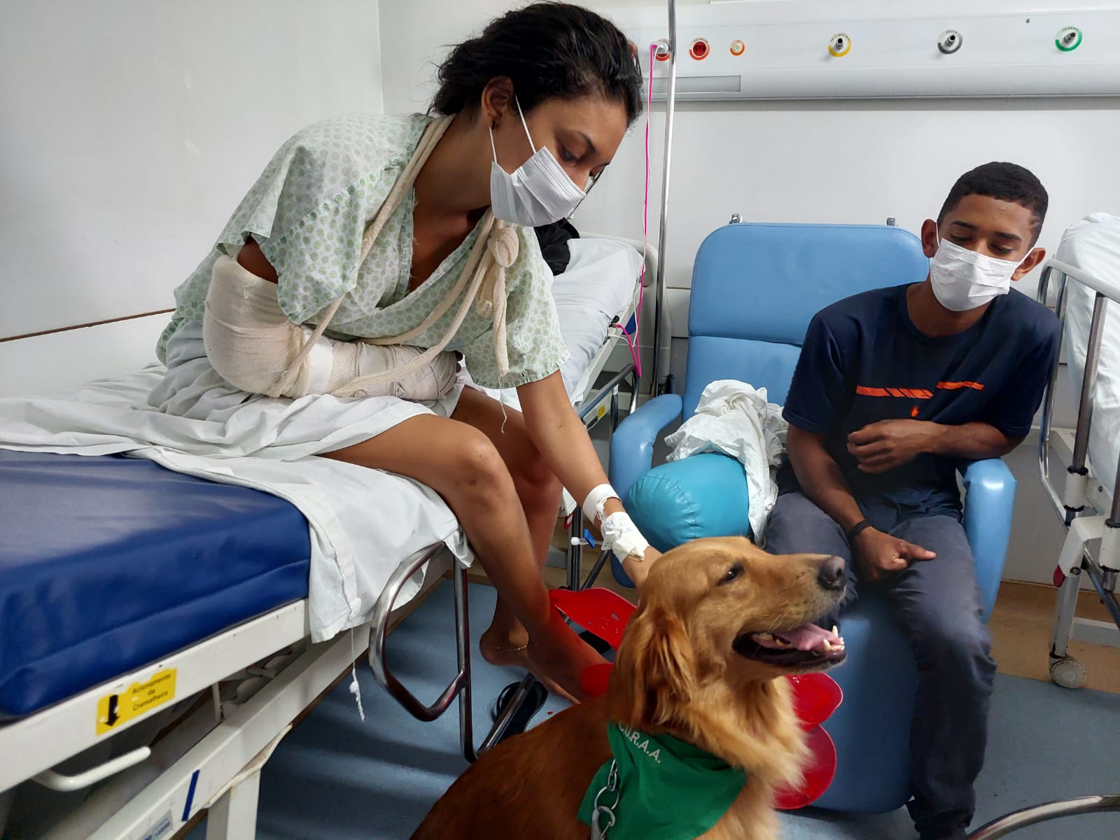 Pacientes internados no Hospital Estadual de Urgências de Goiás (Hugo) receberam, nesta sexta-feira (7), a visita de Vitamina e Capoeira. Tratam-se de duas cadelas terapêuticas, usadas para promover o bem-estar físico e emocional de pacientes em ambientes hospitalares. De acordo com a Comissão de Humanização do Hugo (CH), responsável pela iniciativa, evidências apontam que a presença dos animais diminui o estresse, ansiedade e até a pressão sanguínea dos pacientes.