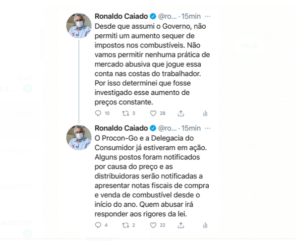 Em dois posts publicados nos Twitter nesta quinta-feira, o governador Ronaldo Caiado (DEM) disse que partiu de uma ordem dele a investigação contra postos de combustível suspeitos de praticar preços abusivos em Goiás. A investigação começou nesta semana e já há postos notificados a apresentar documentos fiscais.