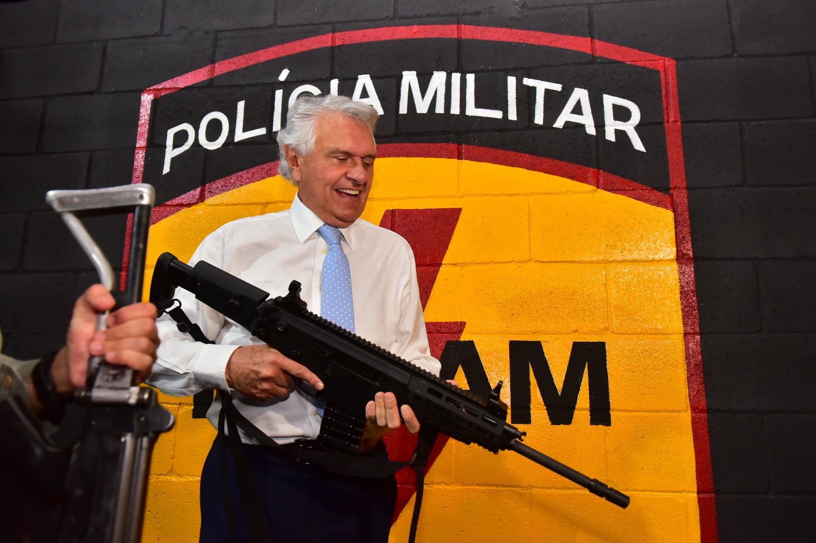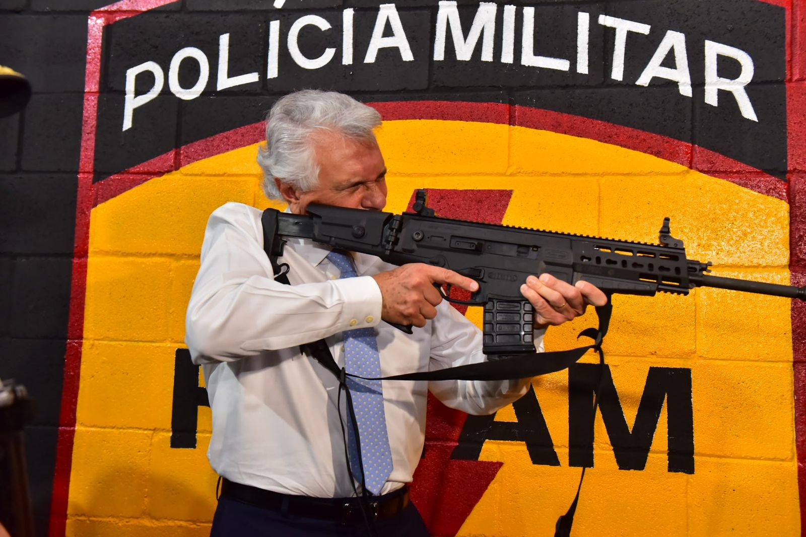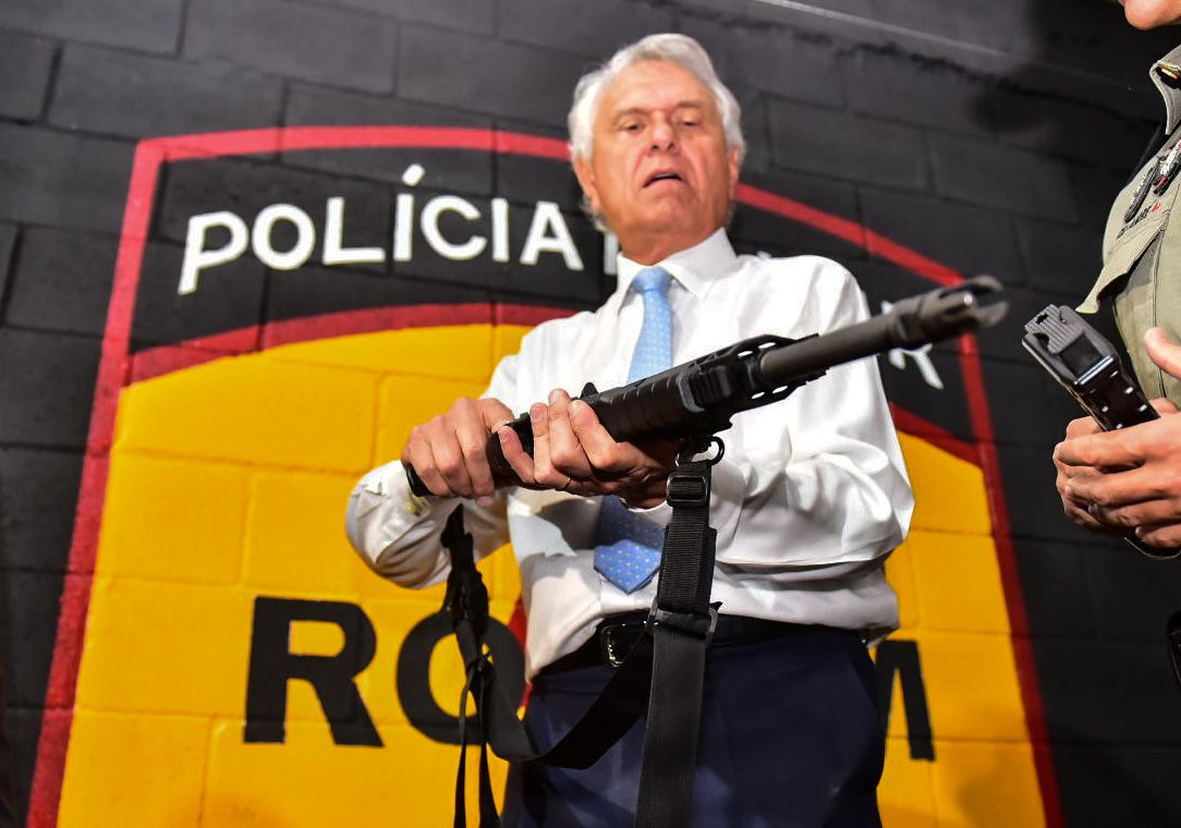 O Governador Ronaldo Caiado posou para fotos com um fuzil ARX 200 Beretta calibre 7,62 da Polícia Militar de Goiás durante a inauguração do Tiródromo das Rondas Ostensivas Táticas Metropolitanas (Rotam) de Goiânia. A instituição celebra, nesta terça-feira (6), aniversário de 42 anos, bem como seus 21 anos de independência na corporação.