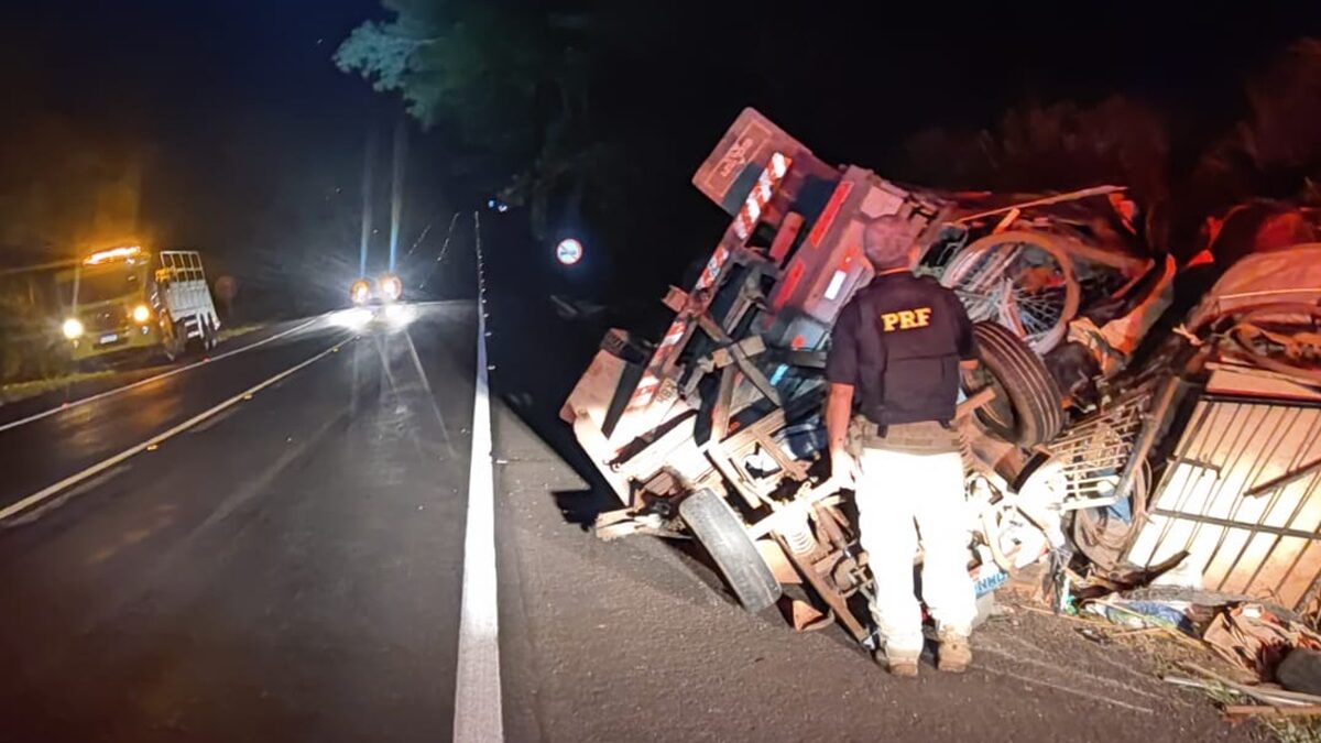 Caminhão com mudança capota na BR-153 em Jaraguá com idoso, mulher, criança e animais