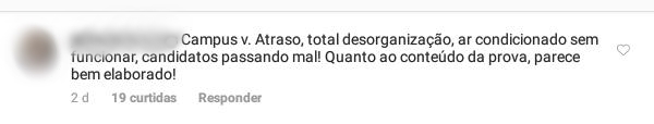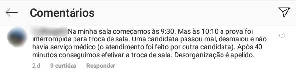 “Na minha sala começamos às 9h30, mas às 10h10 a prova foi interrompida para a troca de sala”, diz outro relato. “Uma candidata passou mal, desmaiou e não havia serviço médico (o atendimento foi feito por outra candidata). Após 40 minutos conseguimos efetivar a troca da sala. Desorganização é apelido”.