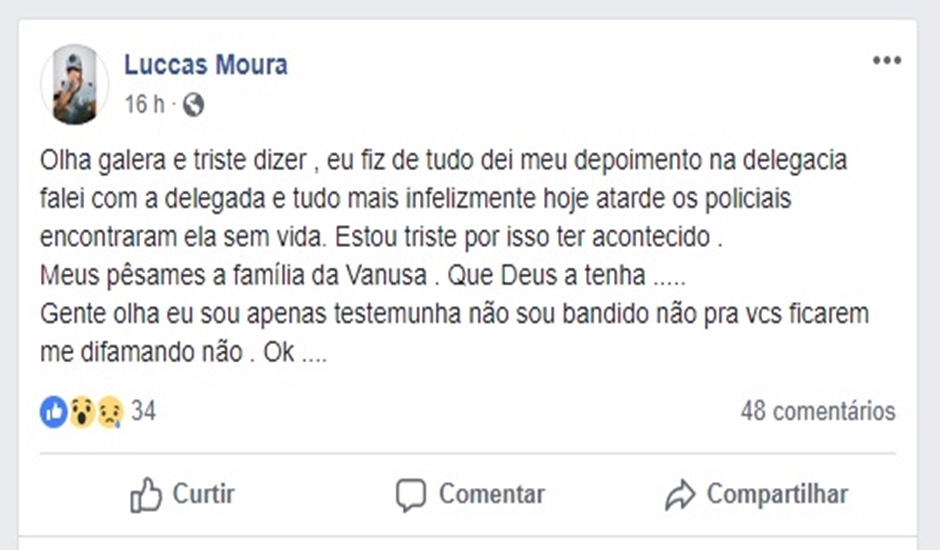“Nossa vida virou de cabeça para baixo”, diz o rapaz, que recorreu às redes sociais para desabafar. Ele demonstrou indignação, após a divulgação da própria imagem como sendo um suspeito. “Eu estou com medo de alguém entrar aqui em casa, fazer algo comigo. Eu a vi pela última vez às 4h30 da manhã, e não vi mais. Teve um apresentador de TV que postou um vídeo no Instagram, e já encheu de gente dizendo um monte de coisas, como se eu fosse bandido”. Ele usou o próprio perfil no Facebook para desabafar: “Gente, eu sou apenas testemunha. Não sou bandido não, para (sic) ficarem me difamando”.