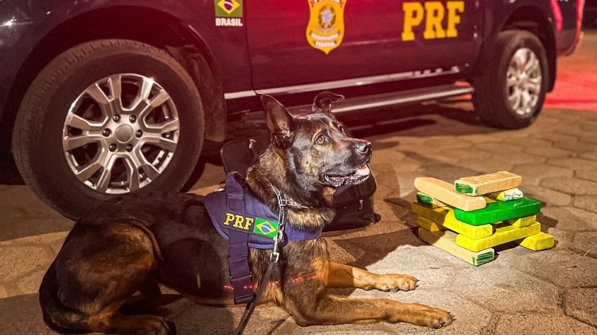 O cão farejador da Polícia Rodoviária Federal (PRF), Rocky, farejou 10 kg de maconha em um ônibus na BR-020, perto da Unidade Operacional da PRF, em Planaltina (DF), na noite de segunda-feira (29). O animal tem quatro anos de experiência na detecção de entorpecentes, segundo a corporação.