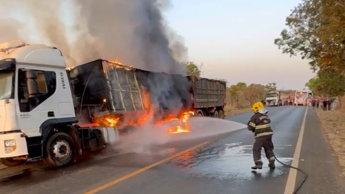 Carreta carregada com tomates pega fogo na GO-010 em Luziânia