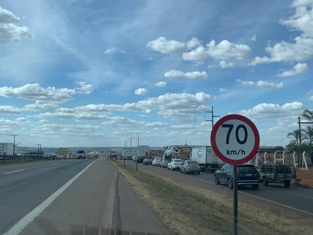 Equipes da PRF e da Triunfo Concebra tentam liberar uma das faixas da pista sentido Brasília. São mais de 5 km de congestionamento, segundo a Polícia Rodoviária Federal (15h27).