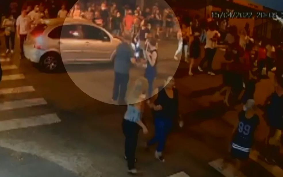 Câmeras de segurança registraram o momento em que o veículo avança sobre as pessoas e atinge a mulher. O motorista vai embora sem prestar socorro.