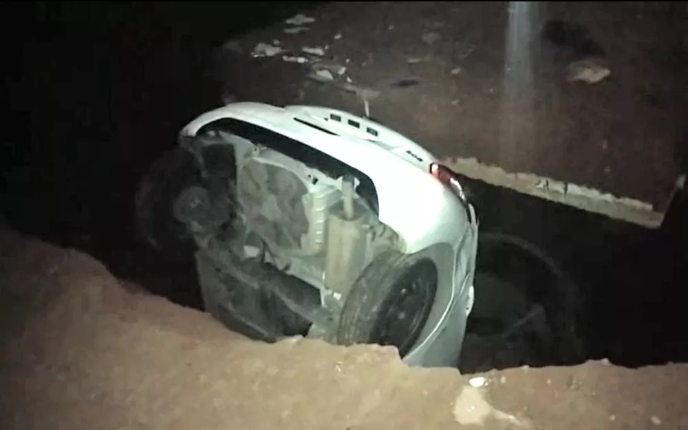 Um carro caiu em uma cratera na Rua Barão de Mesquita, no bairro Jardim Buriti Sereno, em Aparecida. O acidente ocorreu na madrugada d0 último domingo (20) e deixou o veículo praticamente embaixo da terra. Carro precisou ser içado por guincho. Duas pessoas ficaram feridas.