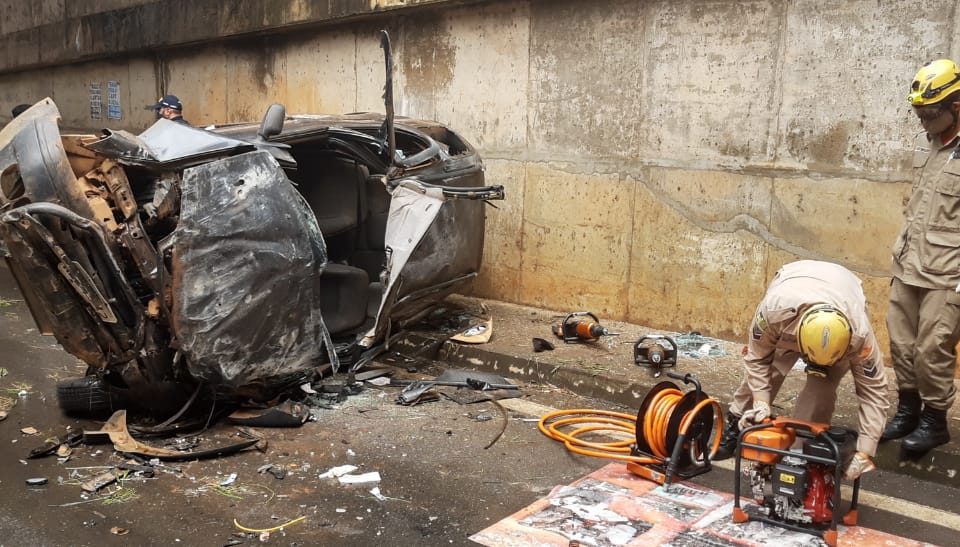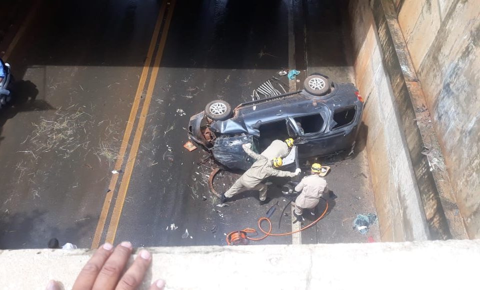 Carro capota e despenca 10 m de viaduto em Anápolis; uma pessoa morreu