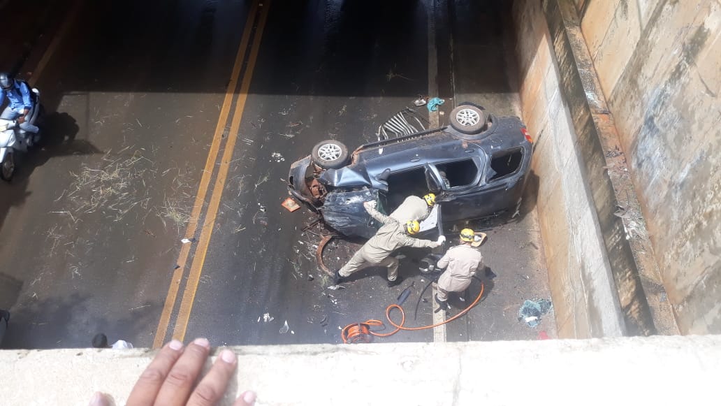 Carro capota e despenca 10 m de viaduto em Anápolis; uma pessoa morreu