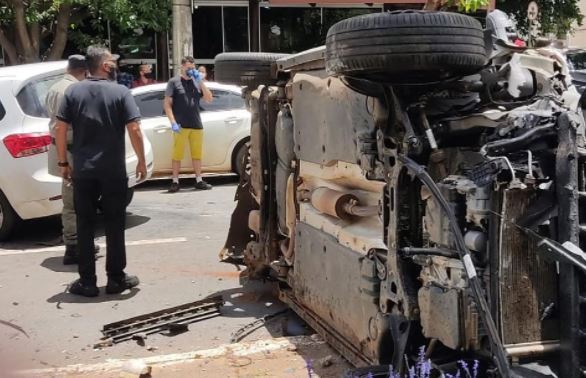 Carro da Secretaria de Saúde capota na avenida República do Líbano, em Goiânia