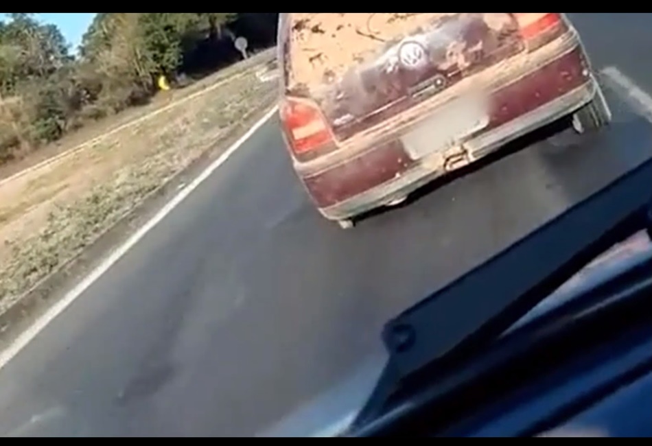 O vídeo que circula nas redes sociais mostra o hatch coberto de poeira acelerando na rotatória de uma rodovia sem a roda traseira esquerda.