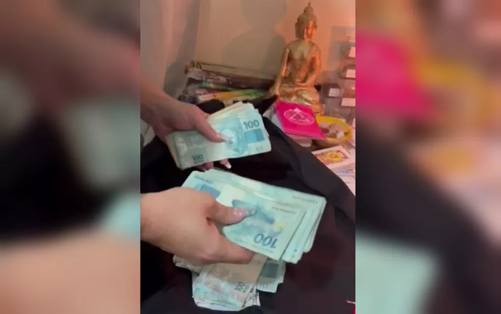 Em um vídeo enviado para o casal, a suposta cigana aparece com o dinheiro em uma mesa e diz frases que, segundo ela, são bênçãos para desfazer “trabalhos” feitos por outra mulher na vida deles. “Peço a permissão dos meus anjos, meus guias, para cruzar todo mal e inveja”, diz a mulher no vídeo.