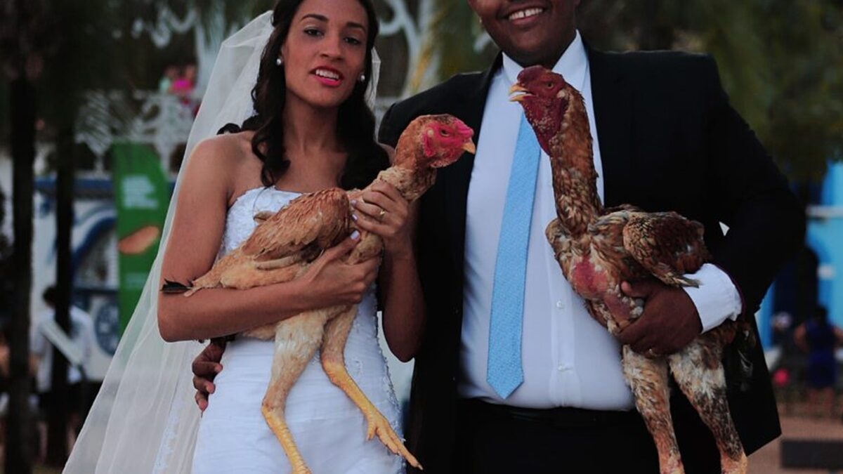 Casal em Goiás faz ensaio de casamento com galo gigante que mede mais de 1 metro