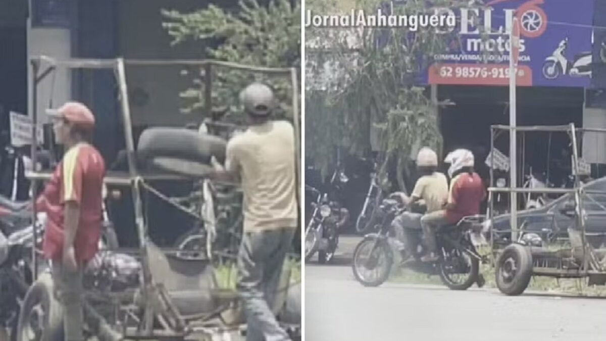 Os dois colocam os pneus furtados em uma carretinha e vão embora do local. O furto aconteceu na tarde da última sexta-feira (9).