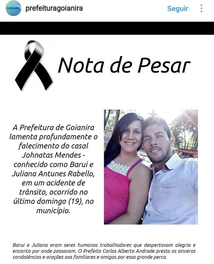 Na manhã de hoje (20)  a prefeitura de Goianira divulgou em seu perfil no Instagram uma nota de pesar pela morte do casal. “Barui e Juliana eram trabalhadores que despertavam a alegria e encanto por onde passavam”, diz o texto.