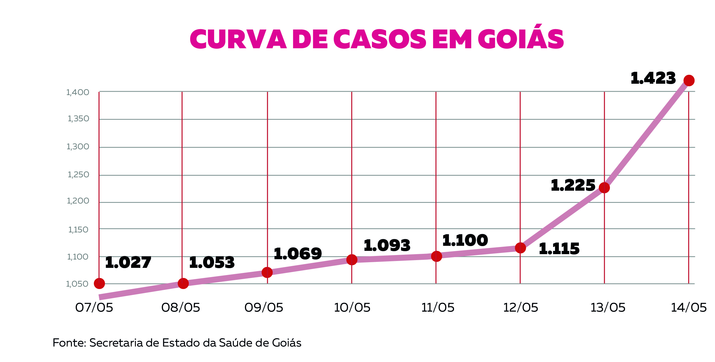 Em uma semana foram registrados 403 novos casos de coronavírus no Estado de Goiás. O número total saiu de 1.027, no dia 7 de maio, para 1.423, registrados nesta quinta (14). Os dados são da Secretaria de Estado da Saúde (SES) e mostram que houve um aumento de 39,24% no período.