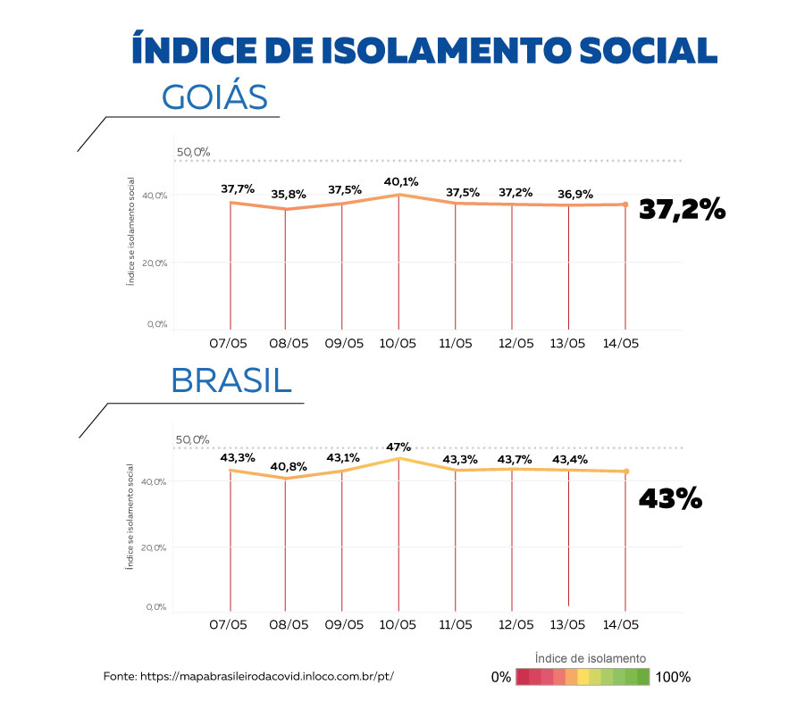 Com relação à semana passada, Goiás desceu uma posição e hoje é o estado que tem o pior índice de isolamento social do país, de acordo com dados do grupo In Loco. Nesta quarta (14), o percentual era de 36,9%, uma redução de 0,4% com relação ao dia 6 de maio.