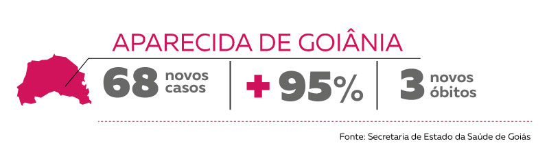 Em Aparecida de Goiânia o número de casos quase dobrou, saindo de 71 para 139. Foram 68 casos novos, um aumento de 95,77%. No último levantamento na cidade o percentual foi de 31,48%. O número de óbitos aumentou de três para seis.
