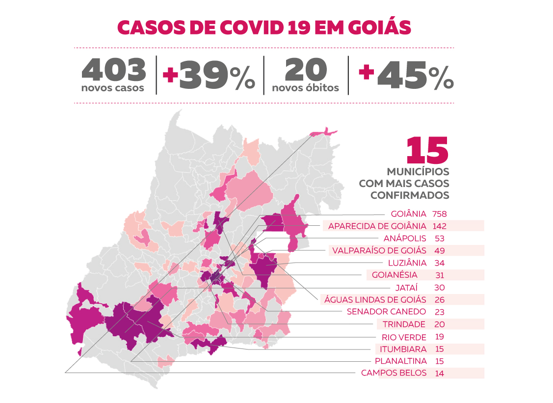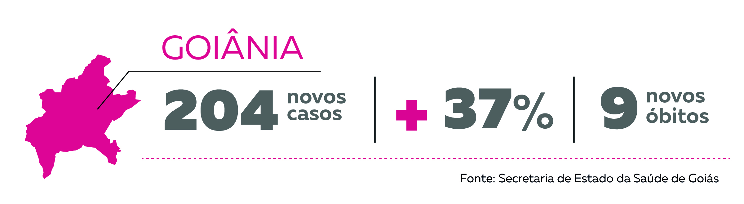 Em Goiânia, o número de casos saltou de 547 para 751. Com 204 casos novos, o aumento foi de 42,85%, acima da média do estado. Goiânia se mantém como o epicentro da pandemia no estado, concentrando 52,77% das confirmações de Goiás. O número de óbitos aumentou de 22 para 30, o que representa um aumento de 36,36% no período.
