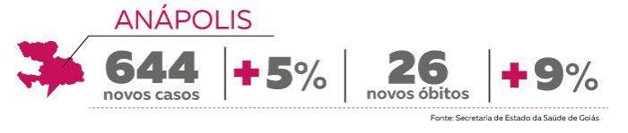 Em Anápolis foram confirmados 644 novos casos da doença em uma semana, um crescimento de 5,8%. O total de casos agora é de 11.828. Foram registrados também 26 novos óbitos no município, um crescimento de 9,6%.