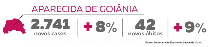 Entre as três maiores cidades do estado, Aparecida de Goiânia registrou o maior aumento. O número de casos de coronavírus na cidade saiu de 31.150 para 33.891, um crescimento de 8,8% no período. O percentual está acima da média estadual e também do que foi notado no período anterior (8,2%).