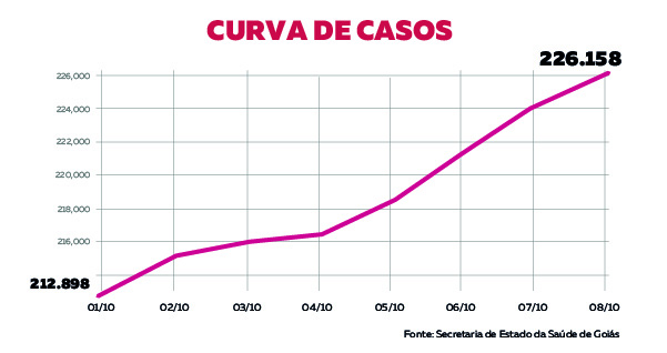 O estado de Goiás registrou 13.260 casos de coronavírus em uma semana, de acordo com os dados fornecidos pela Secretaria de Estado de Saúde (SES)*. Nesta quinta-feira (8), foram registradas 226.158 confirmações, contra 212.898 do dia 1º de outubro. O aumento no período foi de 6,2%.