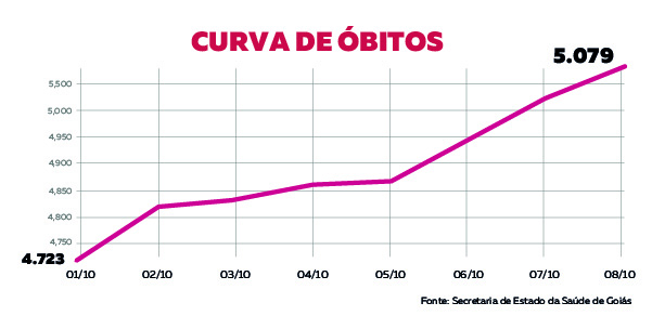 Nesta semana o número de mortes por Covid-19 subiu em um percentual maior do que o de casos confirmados. Foram registrados 356 óbitos no período e o total chegou a 5.079, o que representa um aumento de 7,5%. O aumento foi menor do que nas duas semanas anteriores, que registraram 8,4% entre os dias 24 de setembro e 1º de outubro e de 13,5% entre os dias 17 e 24 de setembro.