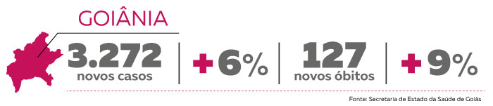 Em Goiânia foram confirmados 3.272 novos casos em uma semana, o que representa um aumento de 6%. Na semana anterior, o crescimento foi de 7,7%. O número de mortes na cidade saiu de 1.387 para 1.514, um acréscimo de 9,2%. O aumento foi maior do que na semana passada (7,7%).