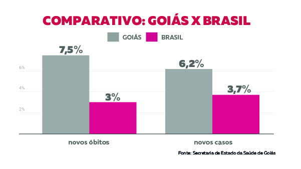 Os dados também mostram que tanto o número de casos quanto o de óbitos continuam crescendo acima da média nacional. Em todo o país, o número de casos confirmados de coronavírus subiu 3,7% no período, chegando a 5.028.444 infectados, de acordo com o Ministério da Saúde (MS). Já o número de vítimas fatais aumentou 3% e chegou a 148.957. Entretanto, a taxa de letalidade no estado de Goiás (2,3%) é menor do que a média brasileira (3%).