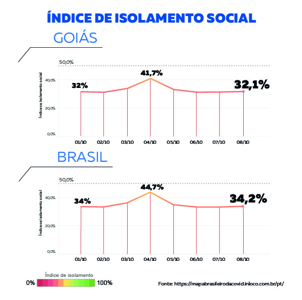 O índice de isolamento social em Goiás manteve-se praticamente o mesmo nesta semana, saindo de 32% para 32,1%, de acordo com o monitoramento da empresa de georreferenciamento In Loco. O estado possui o segundo pior índice de isolamento social do país, perdendo apenas para Tocantins (31,9%). A média nacional é de 34,2% e o recomendado pelas autoridades de saúde é de 70%.