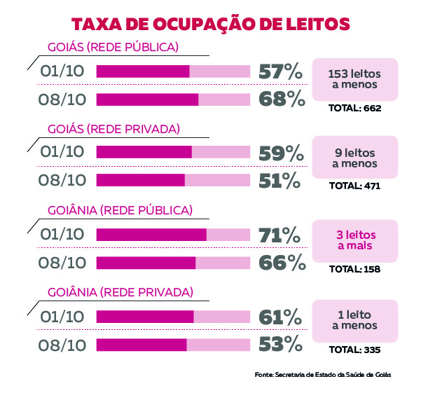 A taxa de ocupação dos leitos destinados ao tratamento de Covid-19 diminuiu de modo geral em Goiás, mas aumentou na rede pública estadual. De acordo com dados da SES, o índice saiu de 57,8% no dia 24 de setembro para 68,4% nesta quinta (1º). Os dados mostram também que o número de leitos disponíveis na rede pública diminuiu de 775 para 622.