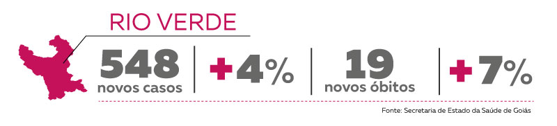 O município de Rio Verde, no Sudoeste do estado, tem o terceiro maior número de casos confirmados da doença. Até quinta (8), foram 11.828 registros de Covid-19 na cidade. Em uma semana, o crescimento foi de 4,8%. Este percentual foi menor do que o apurado na semana anterior, quando foi registrado um crescimento de 5,6%.