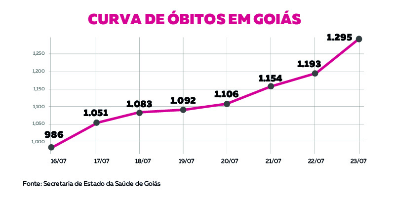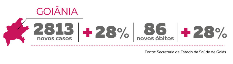 O total de óbitos apurado na cidade até quinta (23) foi de 383. Foram 86 mortes no período, o que representa um aumento de 28,9%. Este percentual foi maior do que o percebido na semana anterior, quando atingiu 17,8%. Goiânia continua a ser o epicentro da doença, concentrando 24,7% dos casos do estado. Na semana anterior, o índice era de 24,2%.